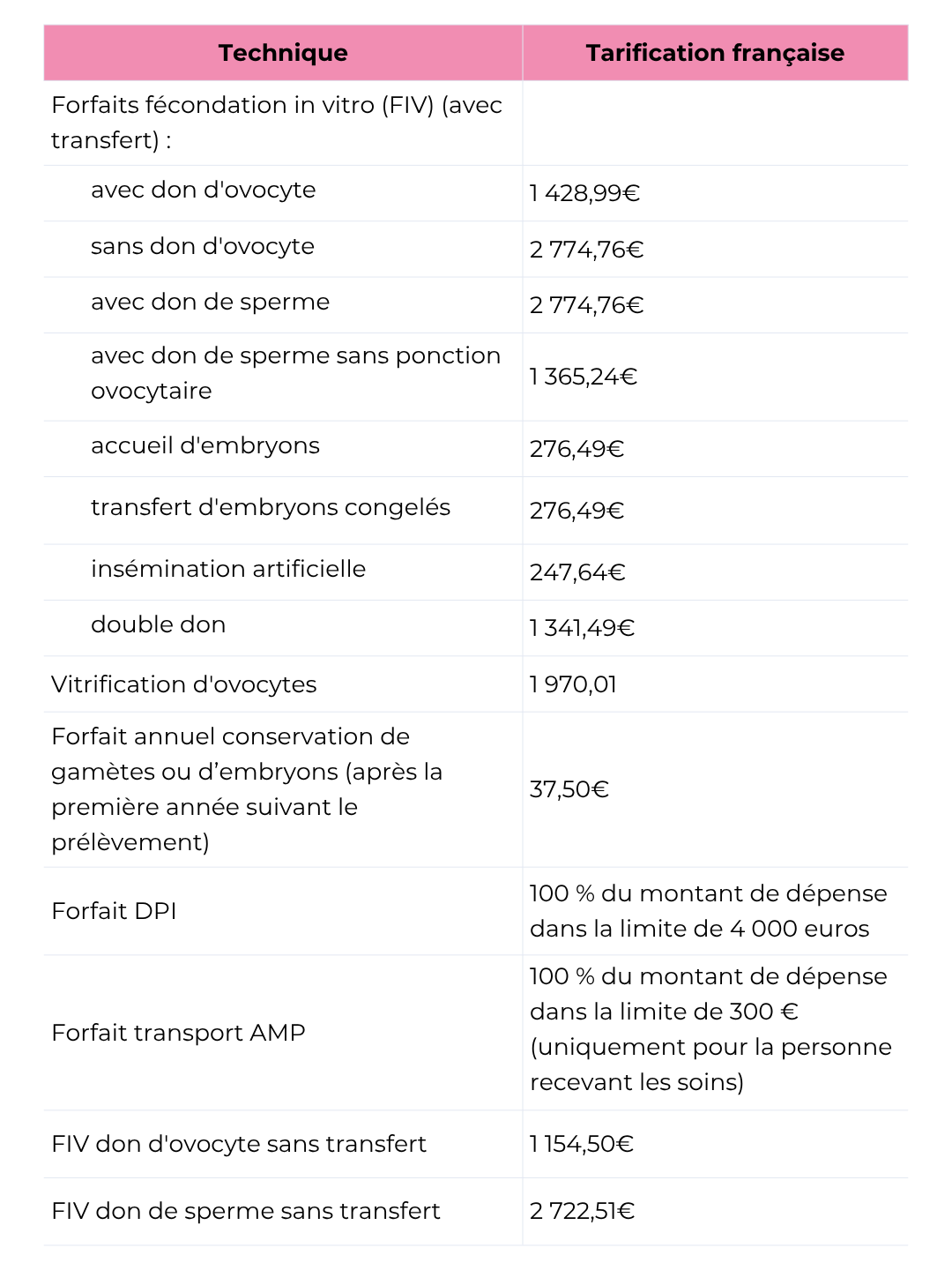 Forfait transport AMP : 100 % du montant de dépense dans la limite de 300 € (uniquement pourla personne recevant les soins)